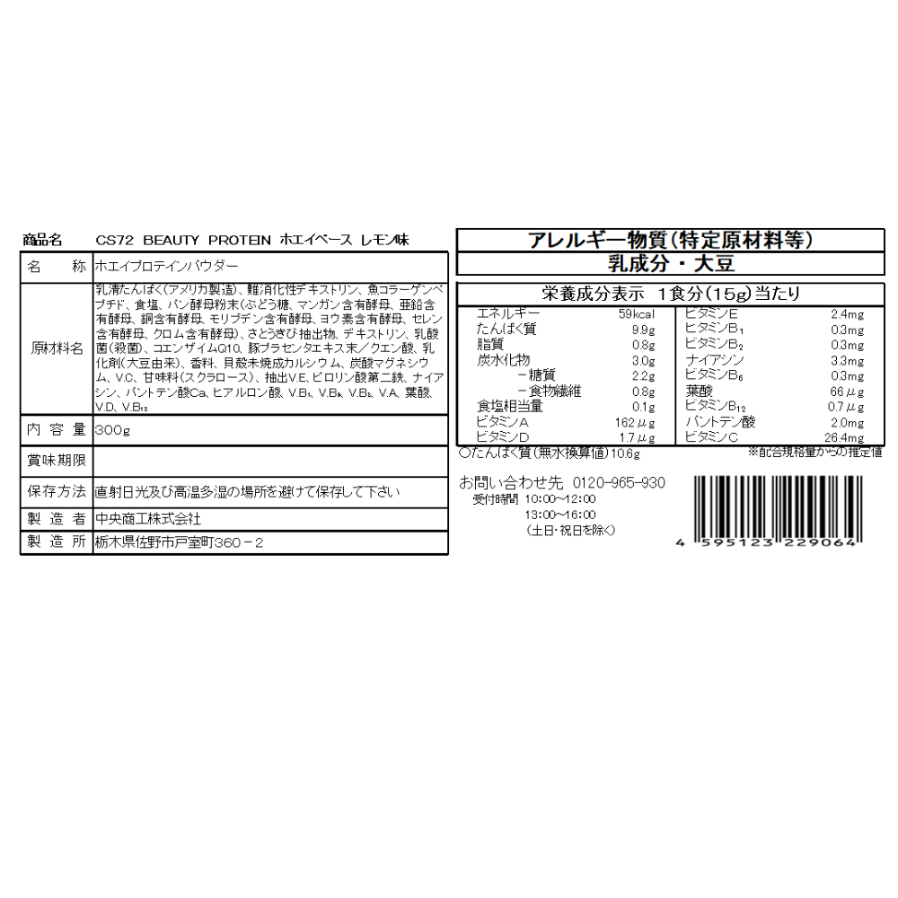 BEAUTY PROTEIN CS72 ホエイプロテイン 300g レモン味 10食分 女性向け