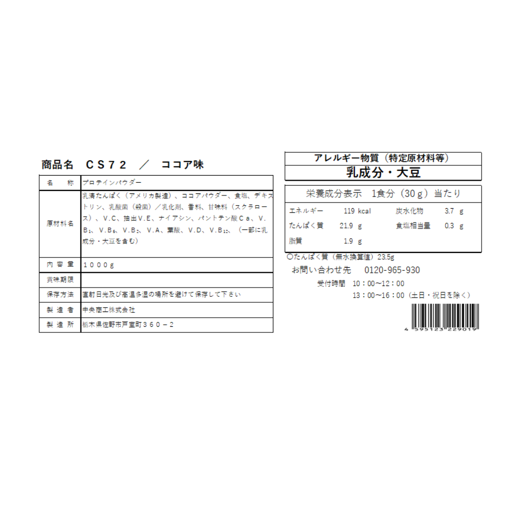 CS72 WHEY PROTEIN は牛乳由来の高タンパクのホエイプロテイン100%。低カロリーで吸収が早く運動直後のタンパク質の補給に最適なプロテインです。また、CS72を食事の置き換えとして召し上がって頂く事で普段の食事では摂取する事が難しい高タンパクを補給する事が可能となります。
