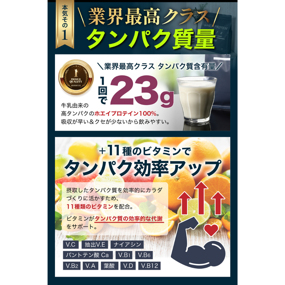 乳清たんぱく(アメリカ製造)、食塩、デキストリン、乳酸菌(殺菌)/クエン酸、乳化剤、香料、甘味料(スクラロース)、V.C、抽出V.E、ナイアシン、パントテン酸Ca、V.B₁、V.B₆、V.B₂、V.A、葉酸、V.D、V.B₁₂、(一部に乳成分・大豆を含む)